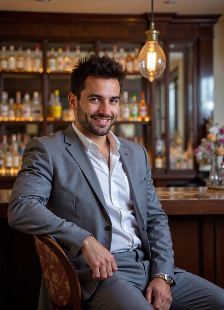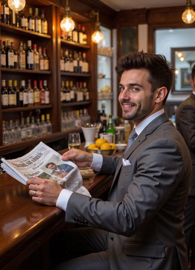 Dort angekommen, steuert er direkt die Bar an, setzt sich, bestellt einen Drink.