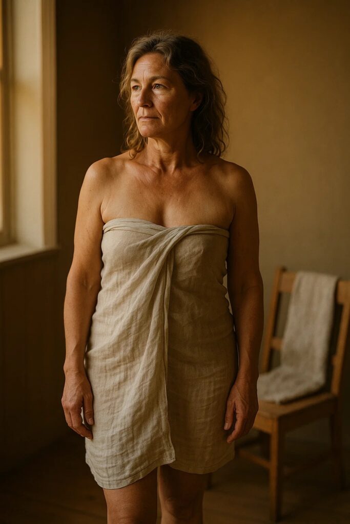 Und da stand sie. Eine wunderschöne Frau, in ein Tuch gehüllt. Kein Bild mehr. Keine Idee. Einfach da. Ich küsste sie. So, wie ich sie immer geküsst hätte. Zart. Klar. Ich hielt ihre Hand und sah sie an. Und da war kein Zweifel mehr.