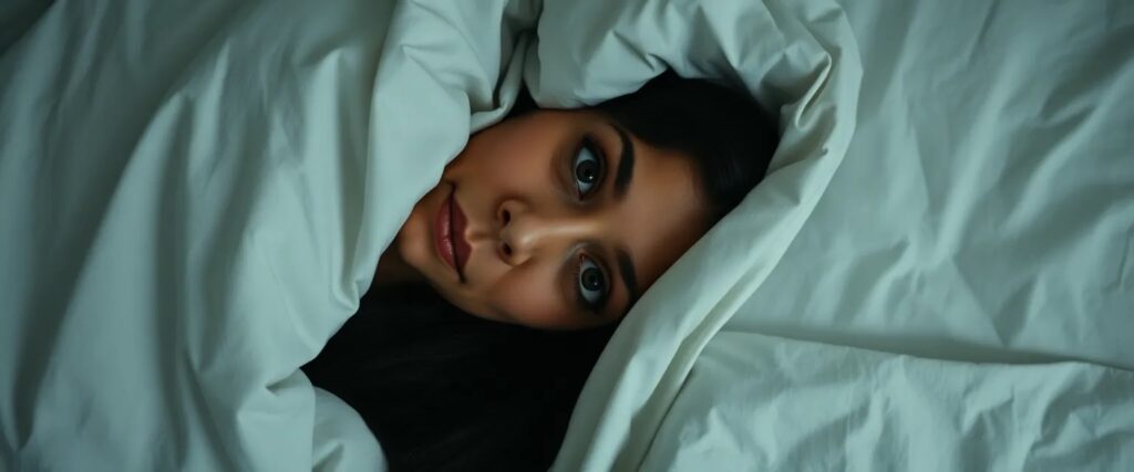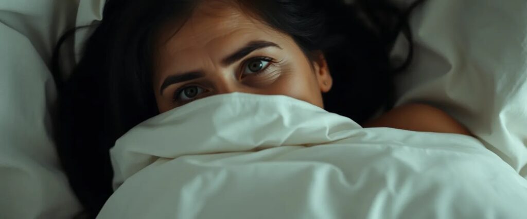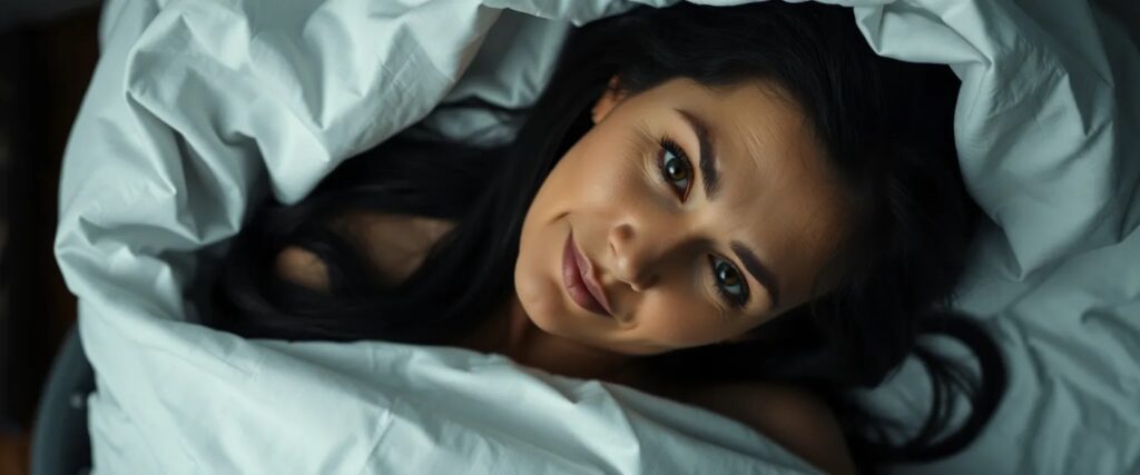 Eine etwa 50-jährige portugiesische Frau mit langen, schwarzen Haaren liegt zugedeckt in einem Bett mit weißen, leicht zerwühlten Laken. Nur ihr Gesicht und vielleicht eine Schulter ragen unter der Decke hervor. Ihre Augen sind dunkel, wach, durchdringend – sie sieht mich an, spricht leise mit mir. Ihre Stimme ist ruhig, fast flüsternd, voller Nähe und etwas Unerklärlichem. Nur ich kann sie sehen, nur ich höre sie. Der Raum ist gedämpft, weiches Licht fällt durch die Vorhänge, als wäre die Zeit angehalten. Etwas an ihr ist nicht ganz real – oder vielleicht bin ich es nicht. Sie ist da, warm, verborgen, und doch spricht sie direkt zu etwas in mir, das schon lange schweigt.