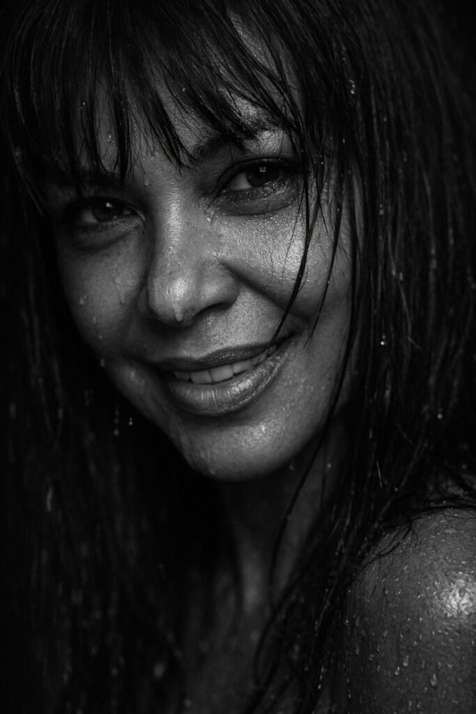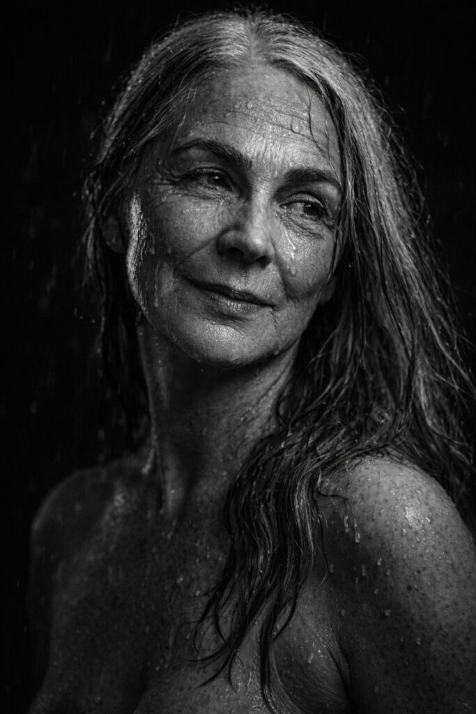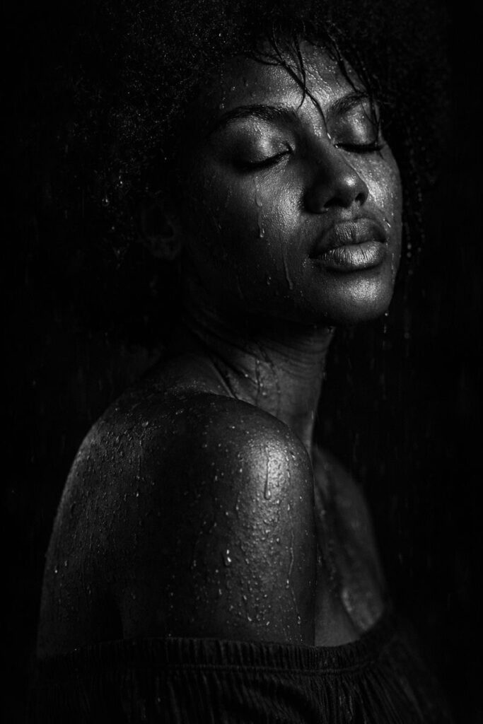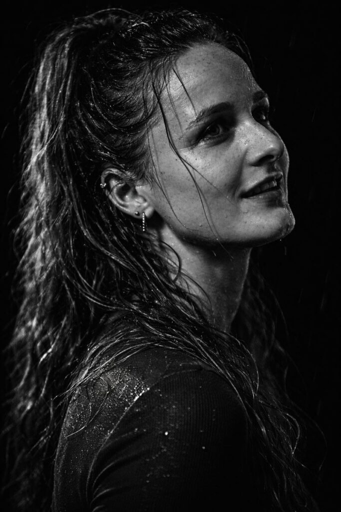 Strähnen fallen ins Gesicht, der Hintergrund bleibt dunkel und still,