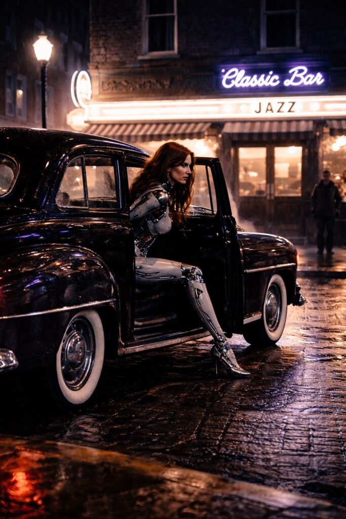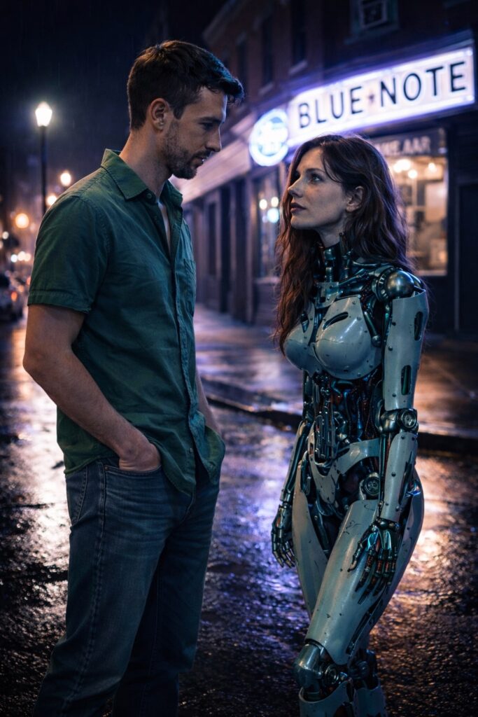 Das Licht der Reklame spiegelt sich im Asphalt, als würde die Nacht selbst atmen. Über der Tür flackert das Schild: Blue Note Jazz. Dampf steigt aus einem Gully auf, und für einen Moment wirkt alles wie ein Film, der sich selbst betrachtet.