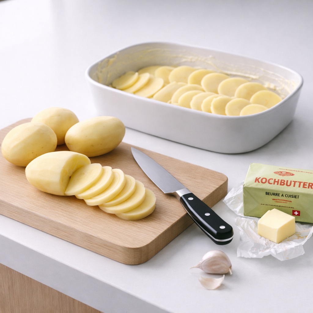 Die Form mit Butter einreiben. Die Kartoffeln in dünne Scheiben schneiden. Rahm und Milch mischen, mit Salz, Pfeffer und einer Prise Muskat würzen und den Knoblauch fein dazureiben.